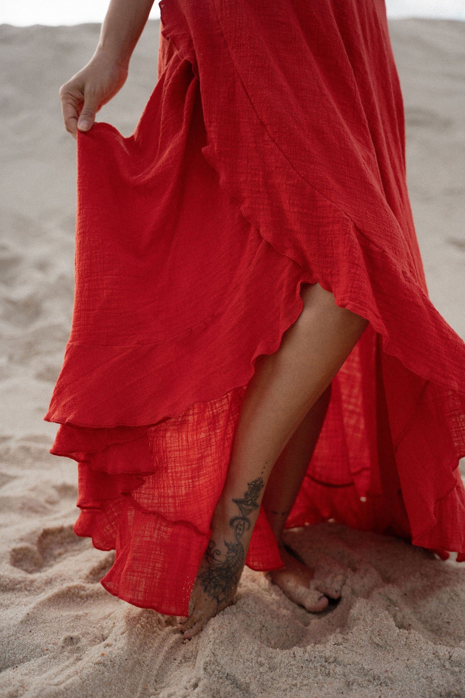 Sua modelagem transpassada se adapta com facilidade a diferentes silhuetas, graças à faixa ajustável na cintura, que permite um caimento personalizado e inclusivo. Os babados ao longo da barra criam um movimento fluido e encantador, com um ar cigano que evoca liberdade, ancestralidade e expressão.