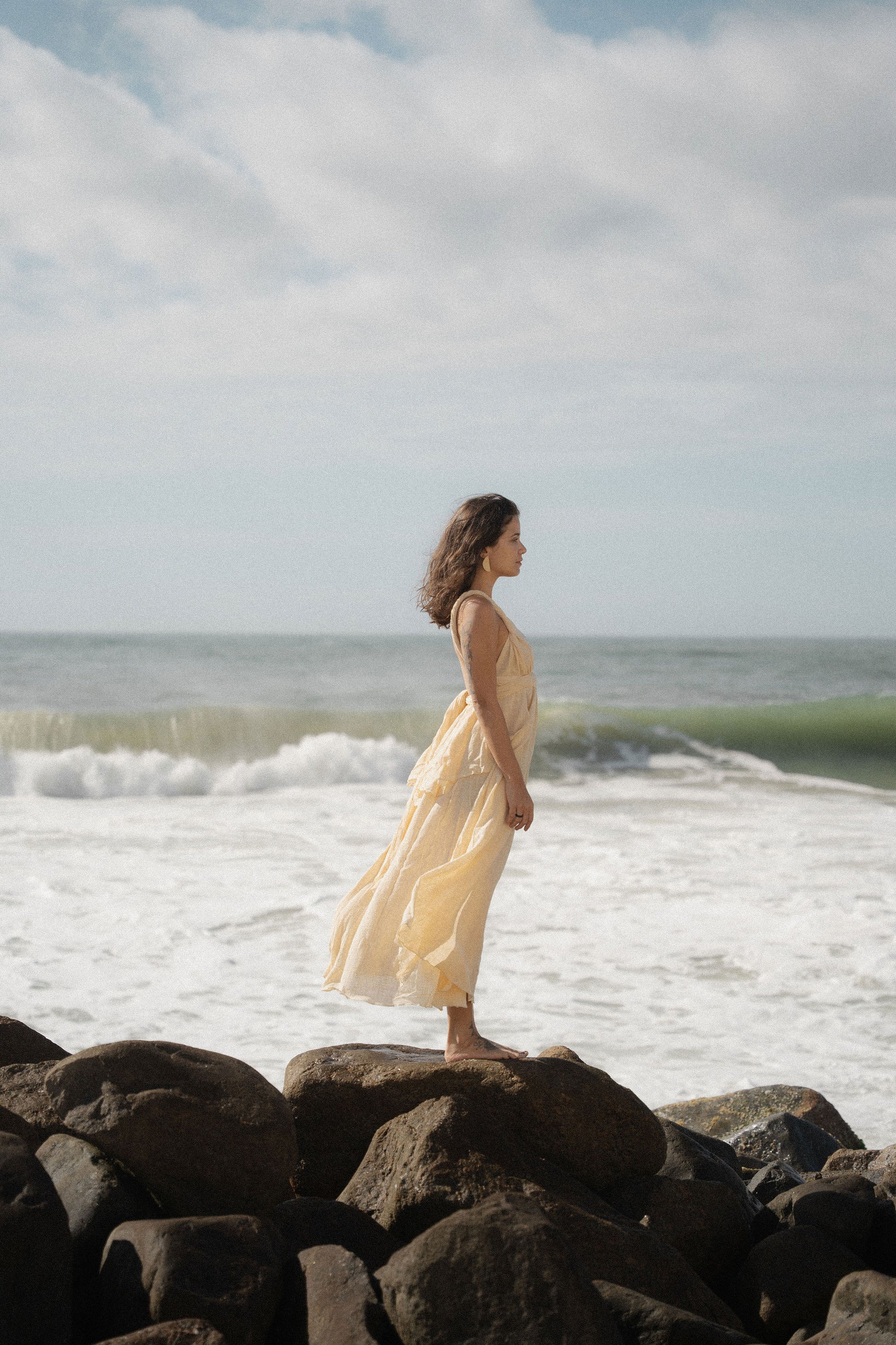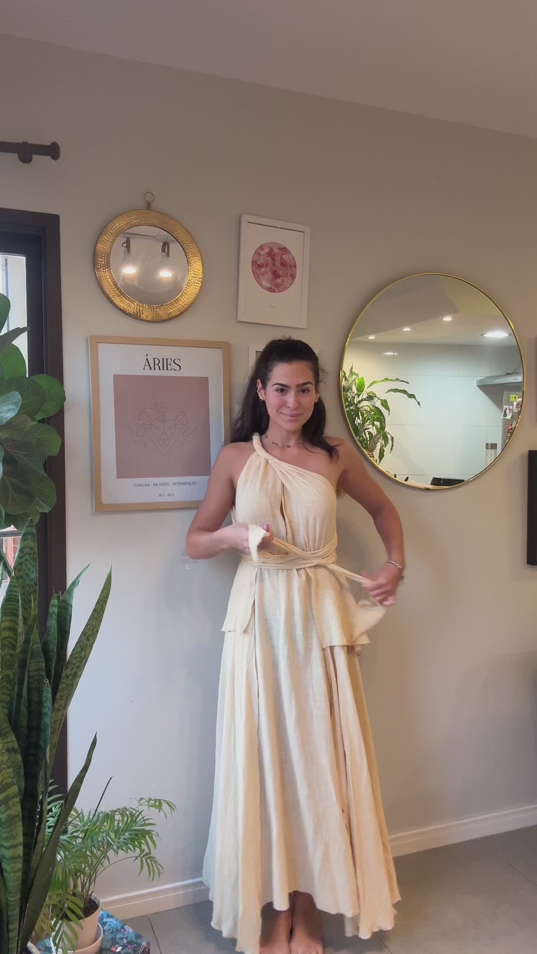 Este é o Vestido Encantaria. Ele é um lembrete para a mulher incrível e transformadora que você está se tornando, aquela que se encanta com a própria jornada. E esse vestido celebra todas essas nossas versões. Ele é feito em 100% algodão, bem levinho e fresco na pele. A modelagem é frente única, com tiras super longas pra você amarrar como quiser, explorando toda sua criatividade. O elástico na cintura garante que ele vista perfeitamente, com muito conforto, e o babado estilo basque atrás dá um charme todo especial. É mais que um vestido, é uma ferramenta para expressar sua força e se sentir deslumbrante.