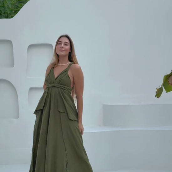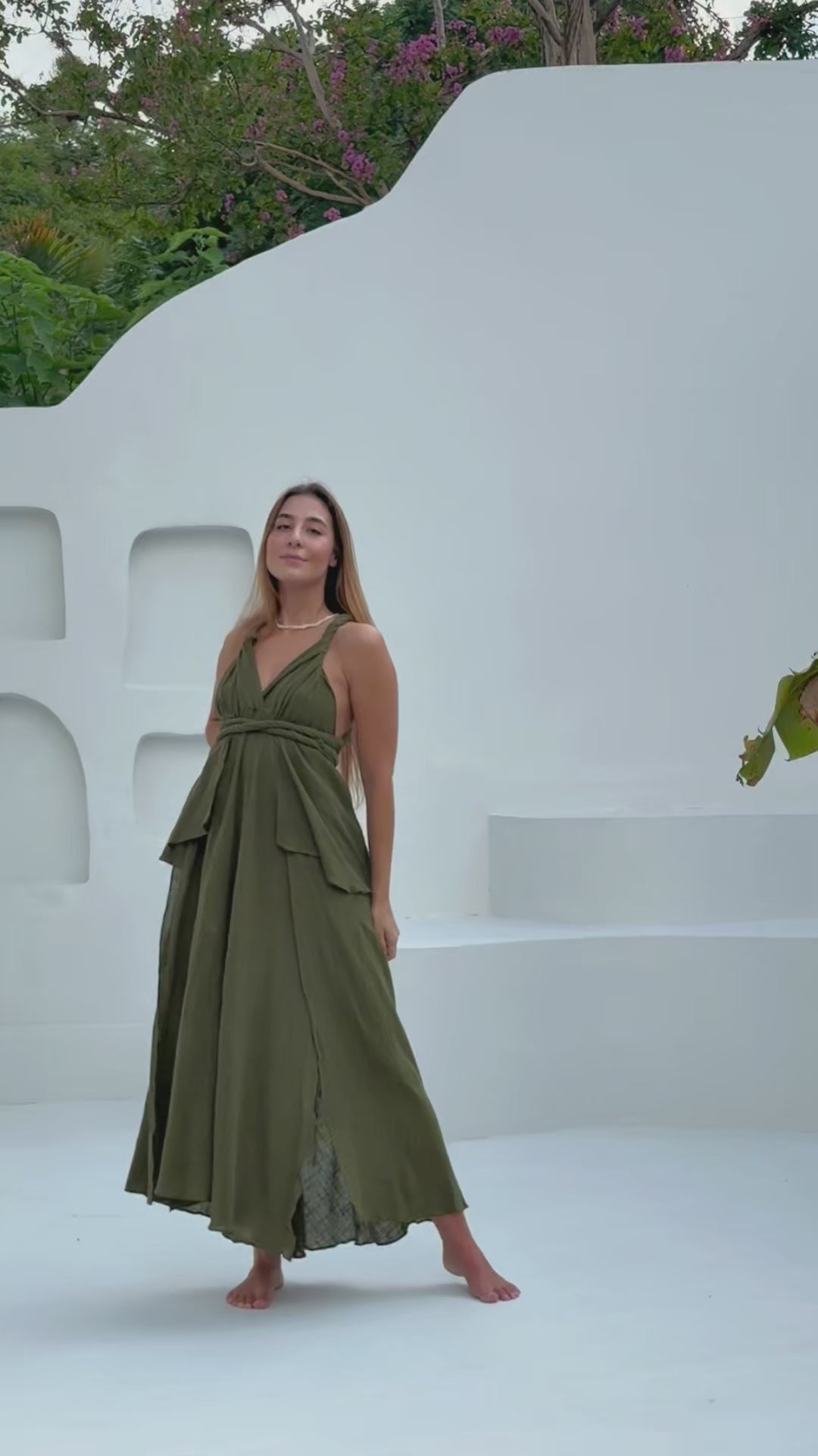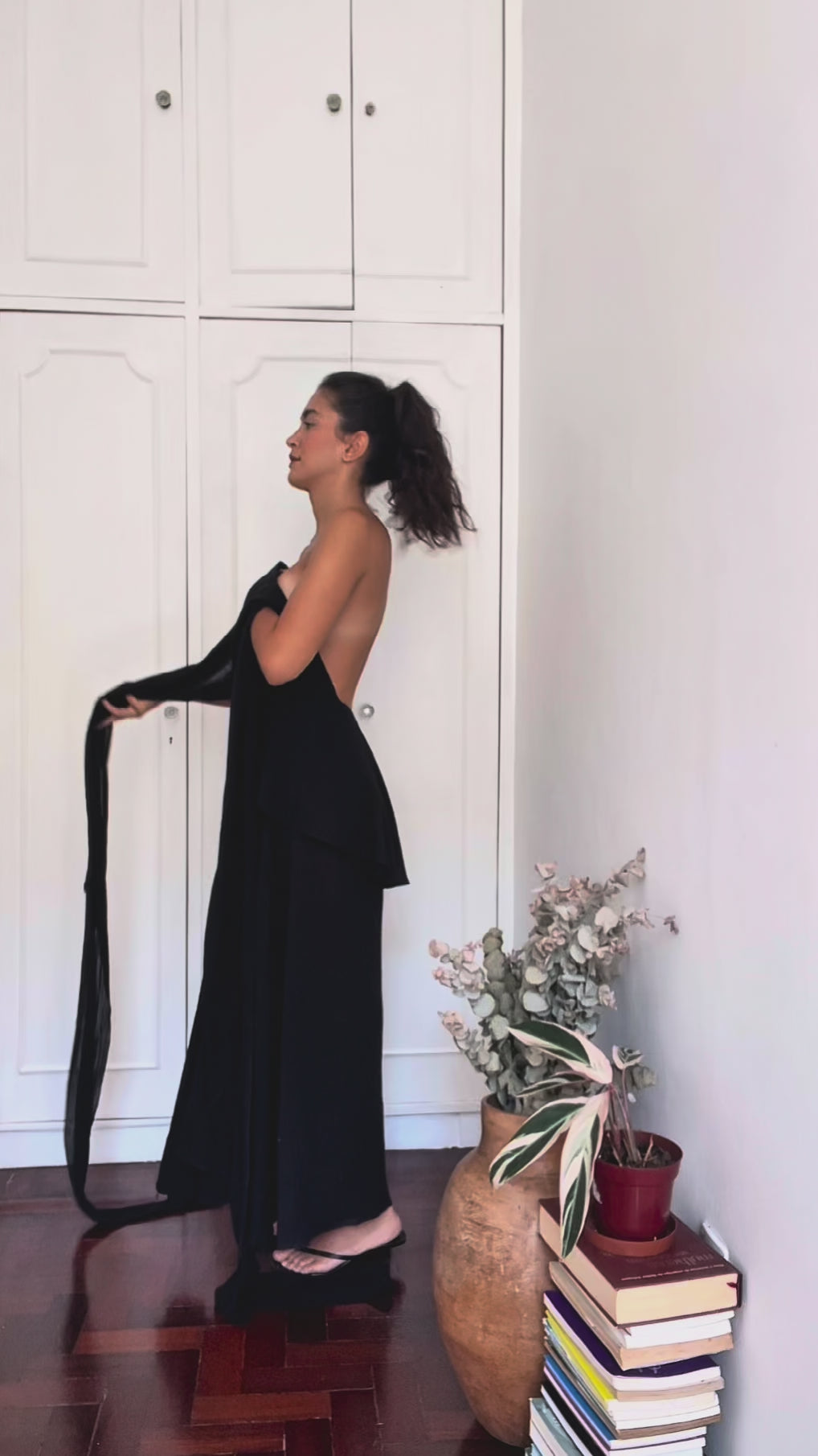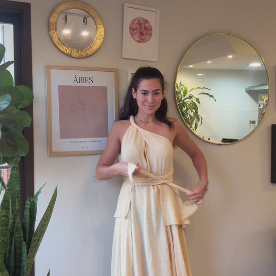 Este é o Vestido Encantaria. Ele é um lembrete para a mulher incrível e transformadora que você está se tornando, aquela que se encanta com a própria jornada. E esse vestido celebra todas essas nossas versões. Ele é feito em 100% algodão, bem levinho e fresco na pele. A modelagem é frente única, com tiras super longas pra você amarrar como quiser, explorando toda sua criatividade. O elástico na cintura garante que ele vista perfeitamente, com muito conforto, e o babado estilo basque atrás dá um charme todo especial. É mais que um vestido, é uma ferramenta para expressar sua força e se sentir deslumbrante.